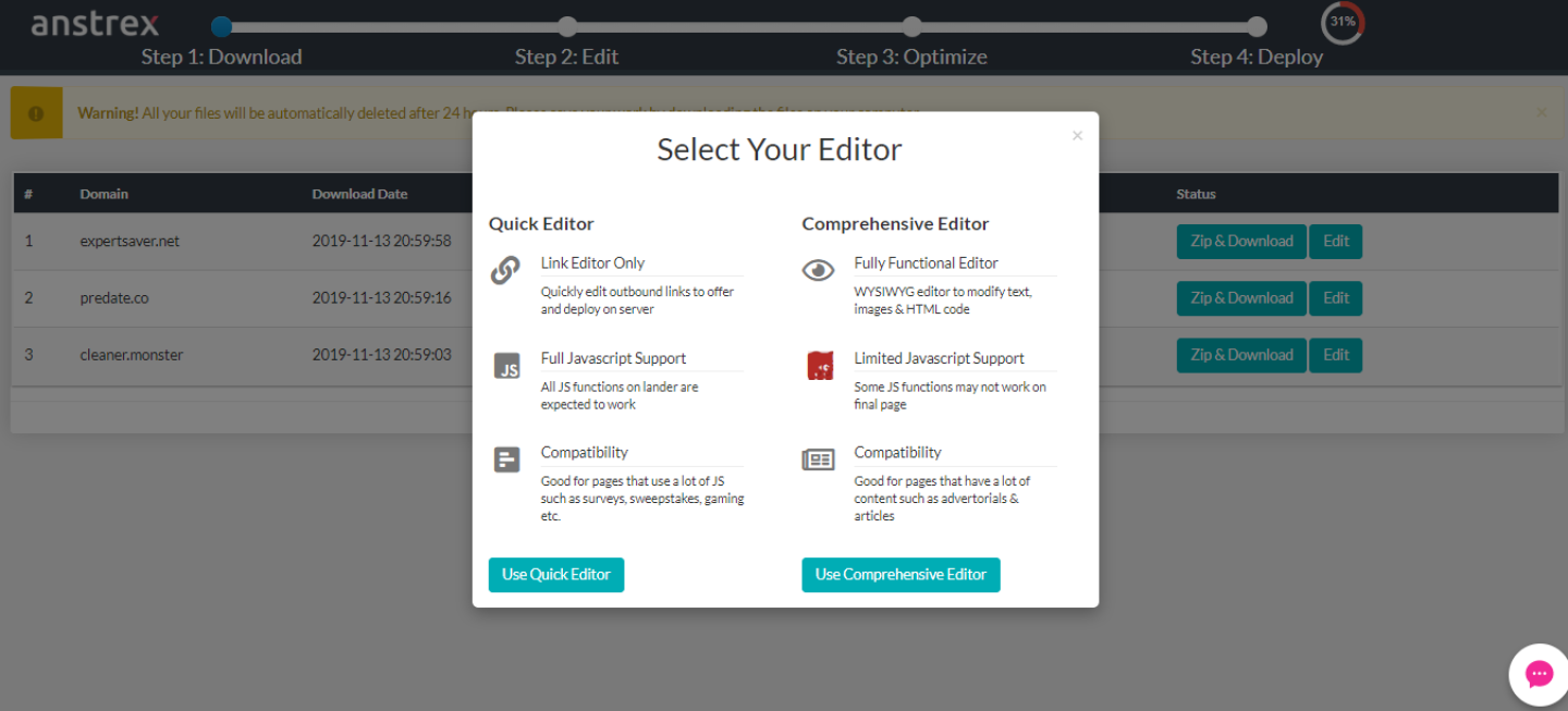 Don't worry if you don't have any idea on how to create a landing page. Here at Anstrex, when you find a landing page you want to copy, you can simply Download and Deploy it to your server. You can even have it cleaned and edited using our WYSIWYG editor. Use the same editor to apply your own affiliate link to the landing page.